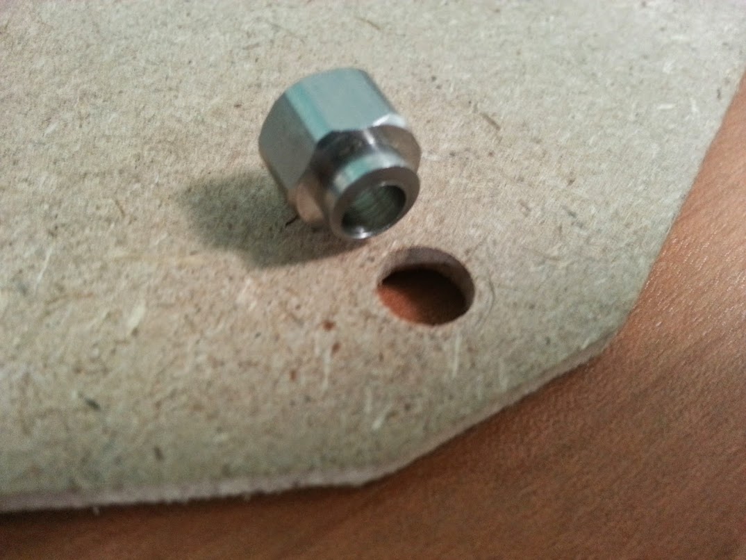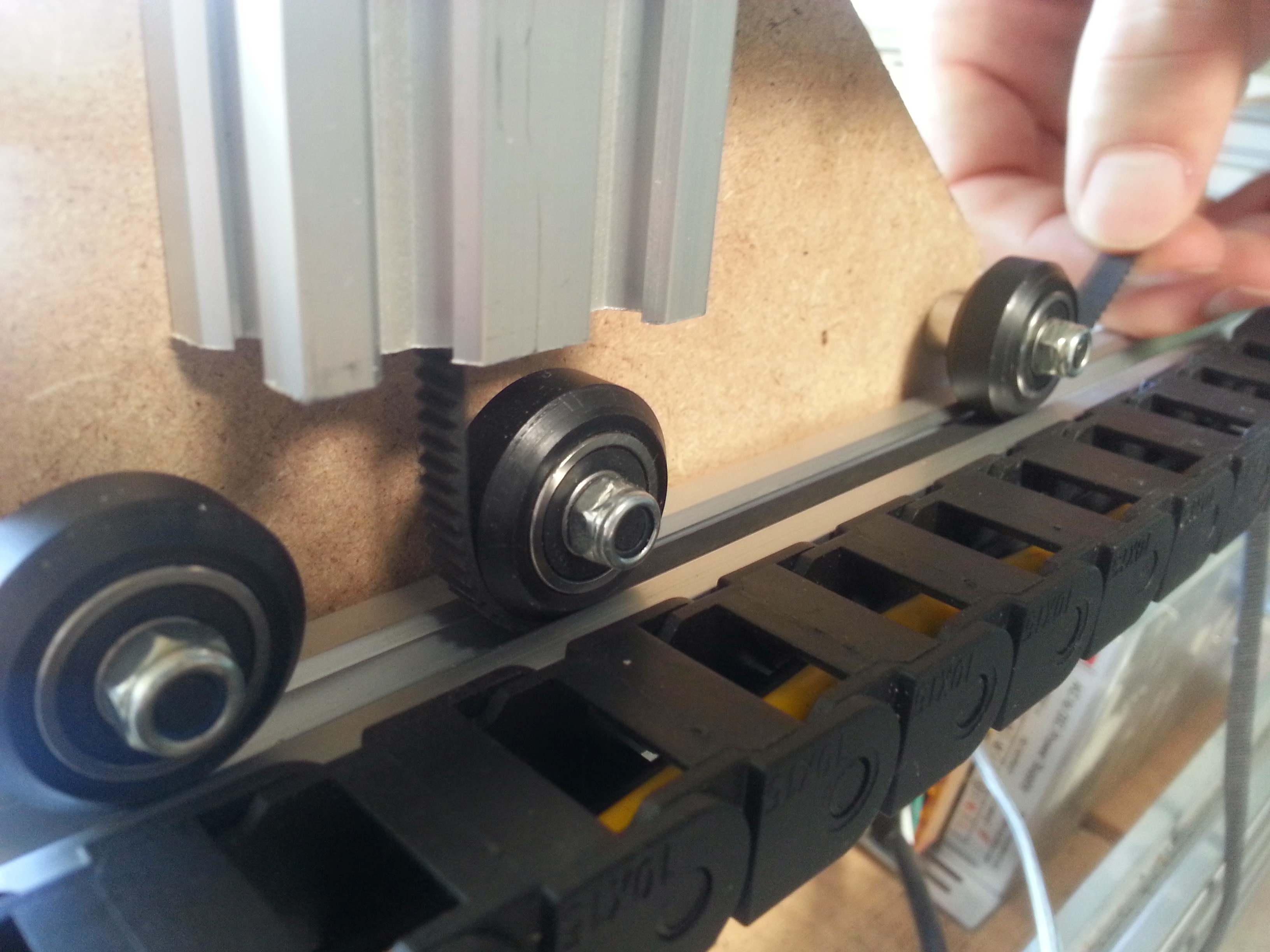 - Attach the three solid V-wheel assemblies with normal spacers onto each plate. The order of parts is: Screw head, Plate, Spacer, Wheel Assembly, Lock-nut. Use a 3mm allen wrench and a 8mm crescent wrench to tighten the assemblies. Use a moderate amount of torque.