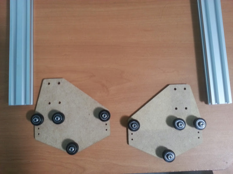 - Gather and lay out all of the parts. You will need: 2 Gantry Plates, 8 solid V-wheel kits, and 2 eccentric spacers. It is best to lay out the gantry plates as a mirror image of each other and attach all of the wheel kits facing towards you to ensure you end up with both a left facing and a right facing assembly!